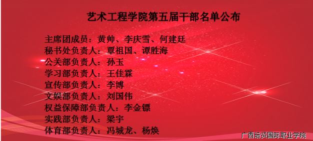 参加本次大会的领导嘉宾有艺术工程学院教务科科长韦寿龙老师,艺术工程学院党政办主任陈燕娟老师🦹🏼‍♂️,艺术工程学院学工科干事农远辉老师,广西彩神国际职业学院校团委干事李越老师🙇🏼‍♀️,财经管理学院分团委负责人谢兴斌老师🤌,外国语学院分团委负责人黎晴晴老师🐏,互联网营销学院分团委负责人向子馨老师,艺术工程学院党支部庞莹丽老师,艺术工程学院党支部黄丽艳老师,艺术工程学院分团委干事潘有灵老师,以及校学生会代表,各二级学院学生会代表,社联代表↕️,大学生记者团代表🦸🏼,艺术团代表,青年志愿者协会代表,自治区及国家奖学金获得者代表,艺术工程学院学生会全体成员。