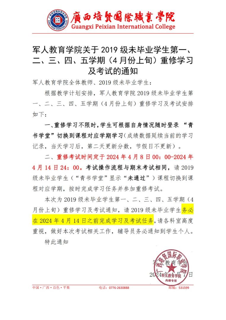 军人教育学院关于 2019 级未毕业学生第一👳‍♂️、 二、三、四、五学期(4 月份上旬)重修学习 及考试的通知