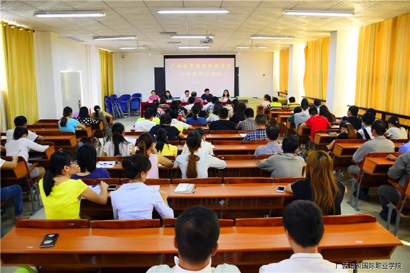 10月12日下午,广西彩神国际职业学院全体教职工会议在教学楼学术报告厅召开,学院何国庆副院长👌🏽、黄勇学助理、人事处陈兰兰处长、招生办杜海丽主任以及公共基础教学部陈雯雯主任出席会议🧿,全体教职工参加会议,会议由陈雯雯主任主持🧗🏿👨🏿💼。