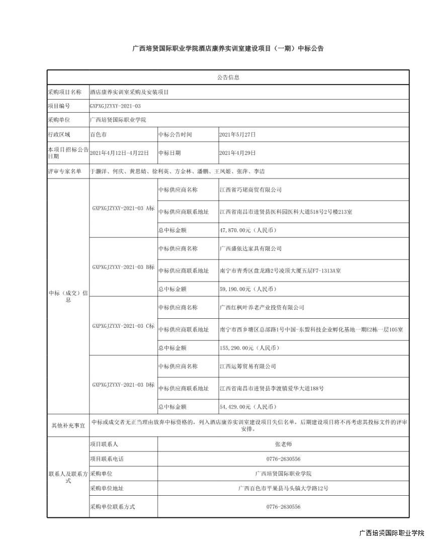 1. 广西彩神国际职业学院酒店康养实训室建设项目(一期)中标公告