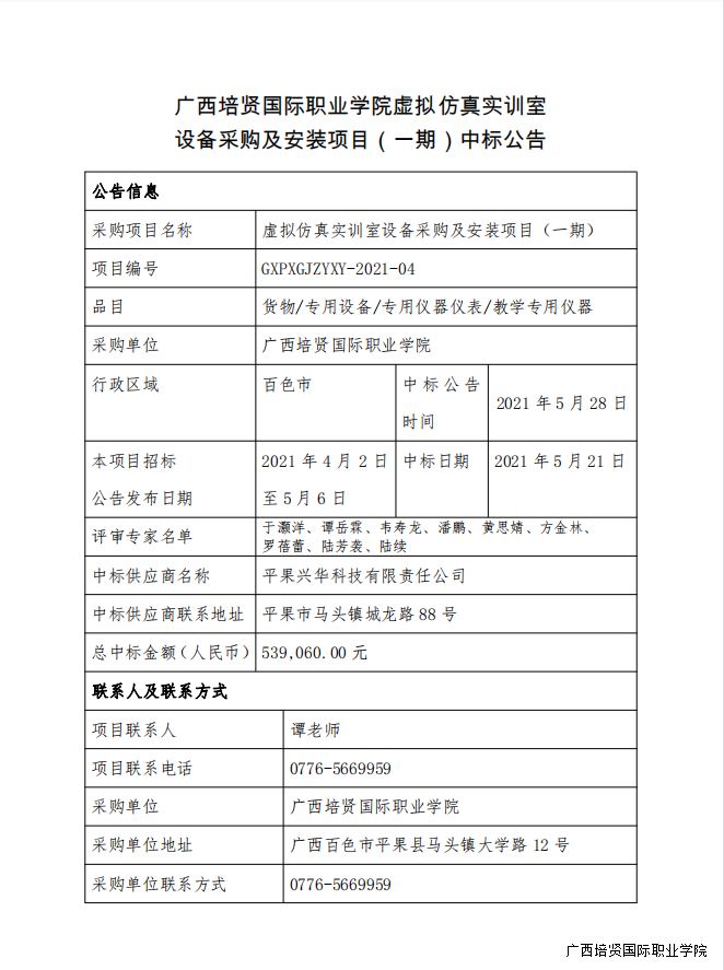 广西彩神国际职业学院虚拟仿真实训室设备采购及安装项目(一期)中标公告