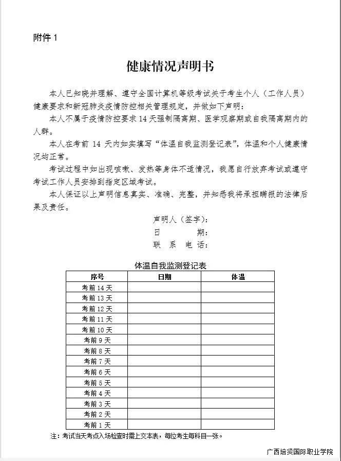 为做好新冠肺炎疫情防控工作,本次考试🛏,根据教育部考试中心的要求,所有考生在考试时均须提交记录有考前14天体温的《健康情况声明书》(见附件1)🙇🏻‍♂️,考生自行打印,如实填写。