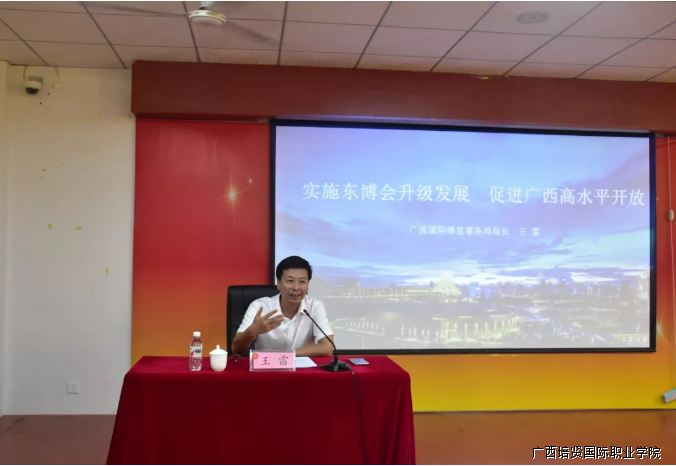 王雷局长从新思想引领新时代,新目标开启新征程;充分认识新形势下深化与东盟合作的重要意义;中国—东盟博览会是中国—东盟重要的开放平台;实施东博会升级发展🦨🌶,更好地服务国家战略和广西高水平开放四大版块给师生们详细讲解东博会🕊。