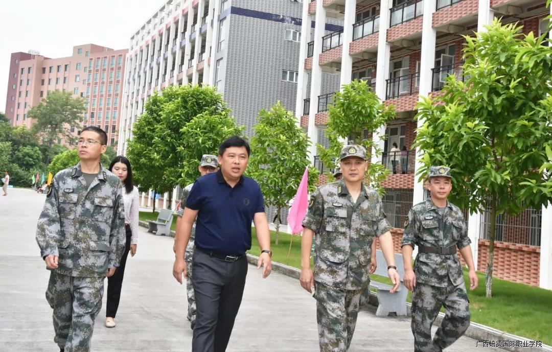 2018年9月10日早🔶,百色市军分区司令员柳景成一行到我院视察指导新生军训工作,平果县武装部部长朱留田🏄🏻‍♂️,百色军区军训教官队长🎙、靖西市人武部副部长樊选华,学院副院长黄勇学等陪同视察🧏🏻。