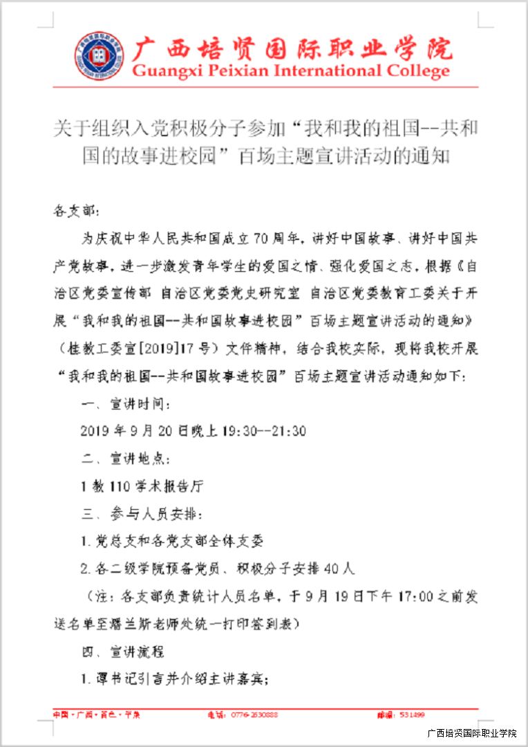 关于组织入党积极分子参加“我和我的祖国--共和国的故事进校园”百场主题宣讲活动的通知