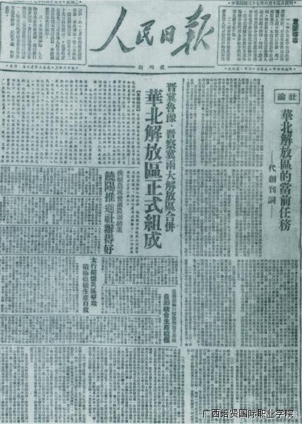 1948年6月15日,晋冀鲁豫解放区《人民日报》与《晋察冀日报》合并后出版的《人民日报》创刊号。