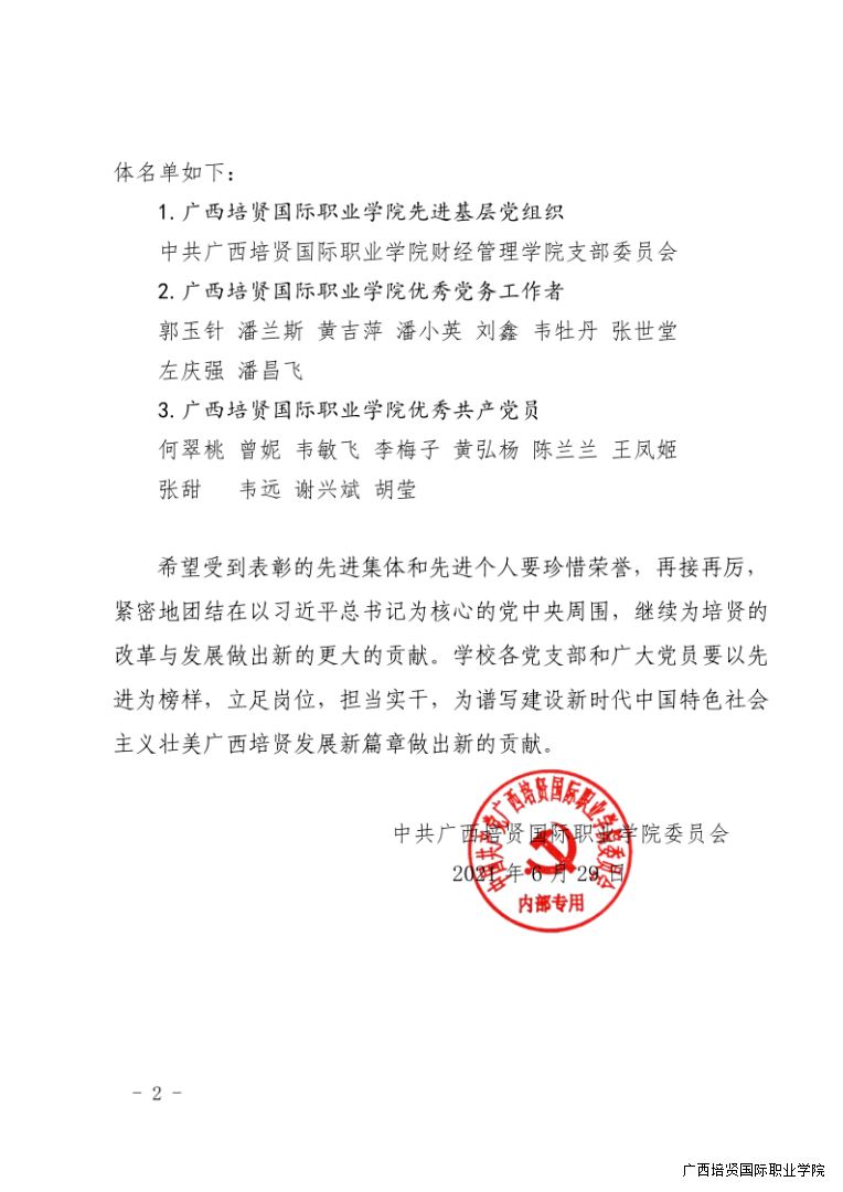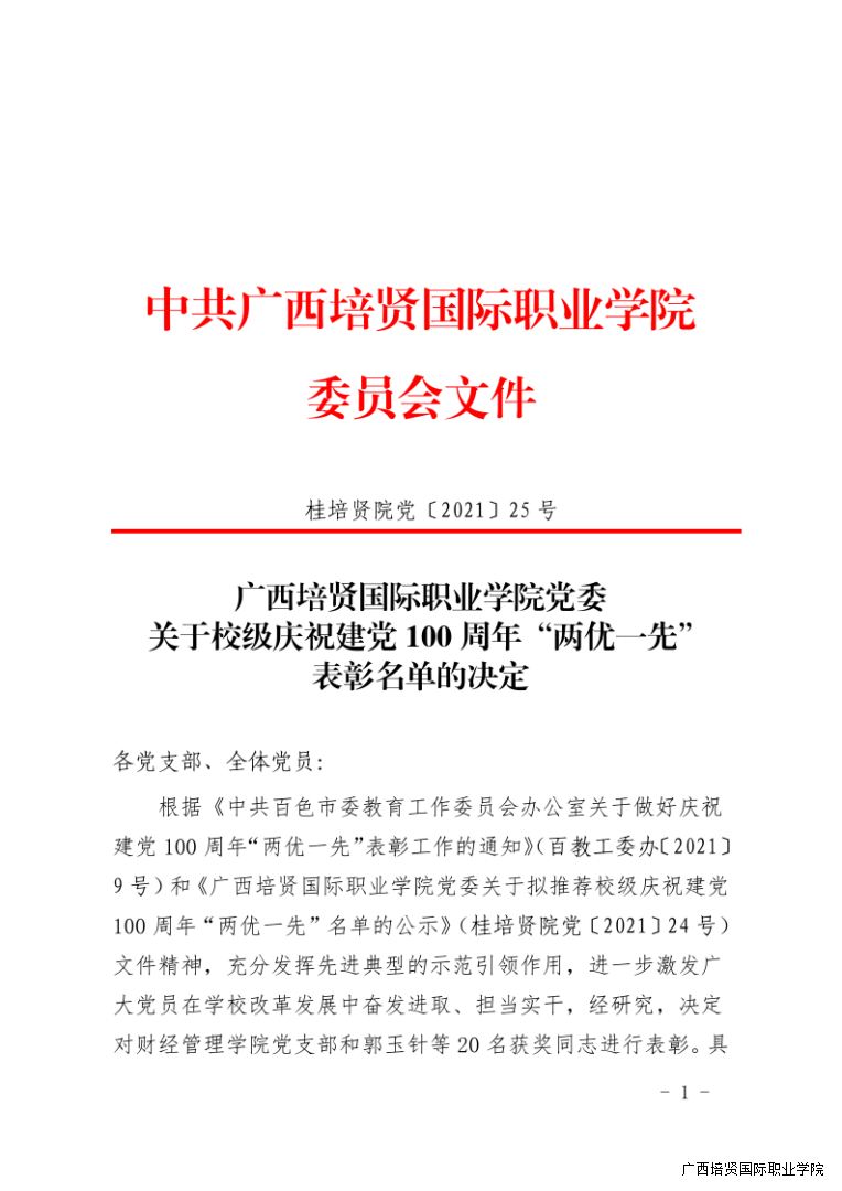1. 关于校级庆祝建党100周年“两优一先”表彰名单的决定