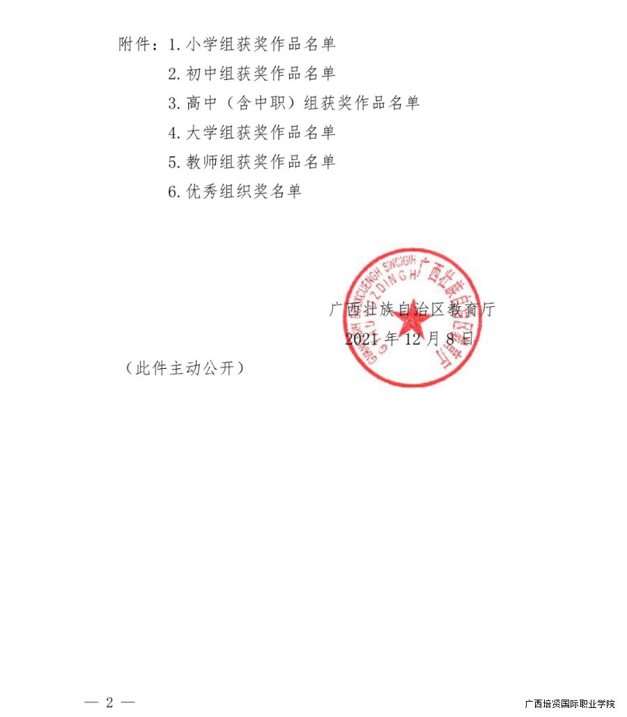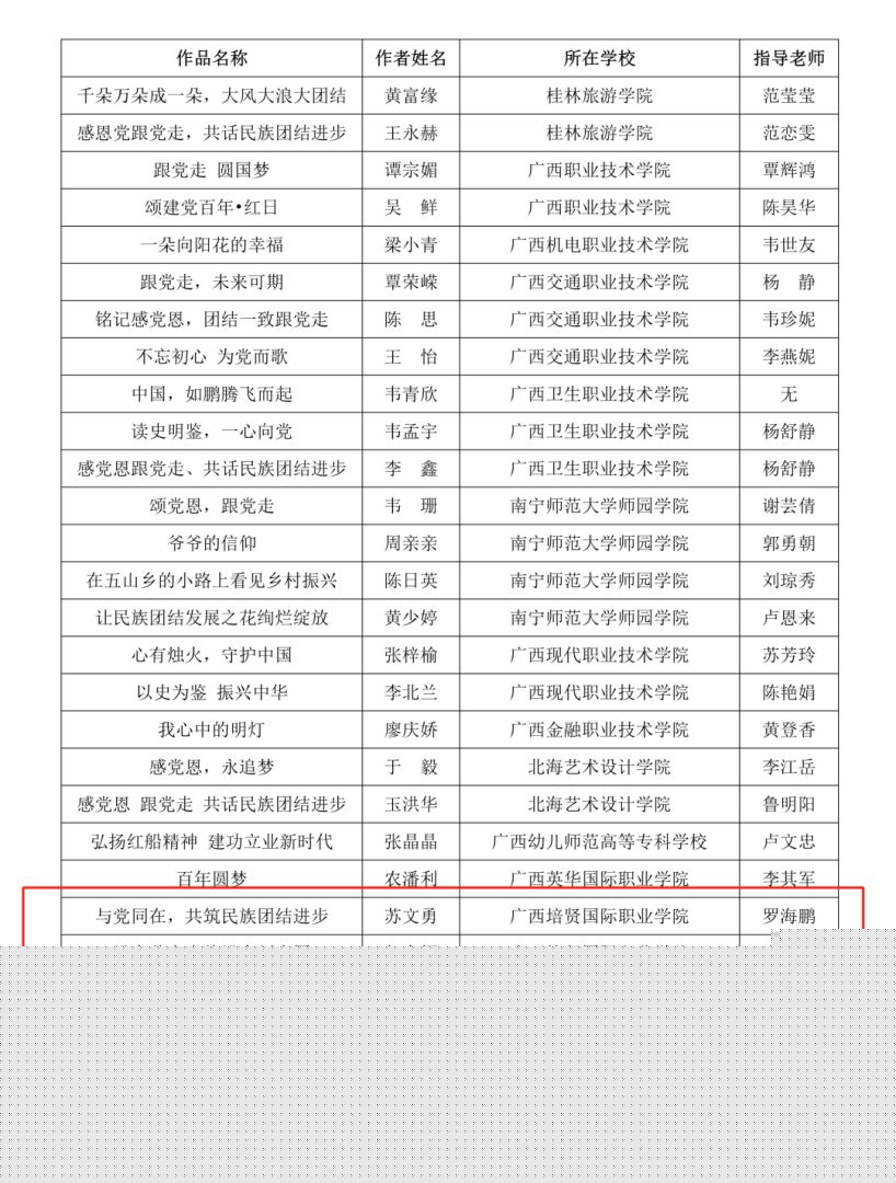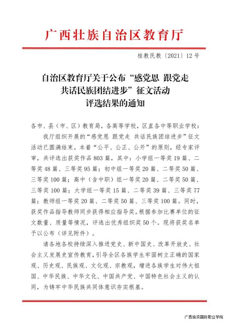 近日🗓,广西壮族自治区教育厅下发《自治区教育厅关于公布“感党恩 跟党走 共话民族团结进步”征文活动评选结果的通知》(桂教民教〔2021〕12号)👓,我校苏文勇同学🧢、何金媚同学的作品荣获大学组三等奖🫛🦯,罗海鹏老师、谢慧珊老师荣获指导奖。
