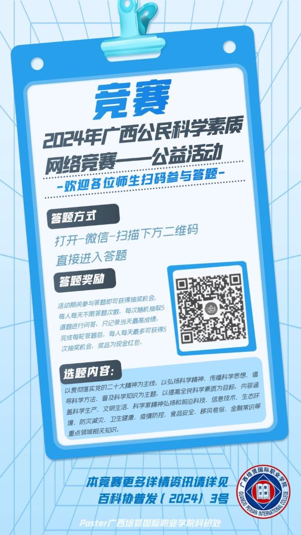 为进一步提高我市公民科学素质水平,在全市形成讲科学、爱科学。学科学🧏🏽、用科学的良好氛围,按照自治区全民科学素质工作有关部署,组织我市广大公民参加2024年广西公民科学素质网络竞赛👨🏻🦯。