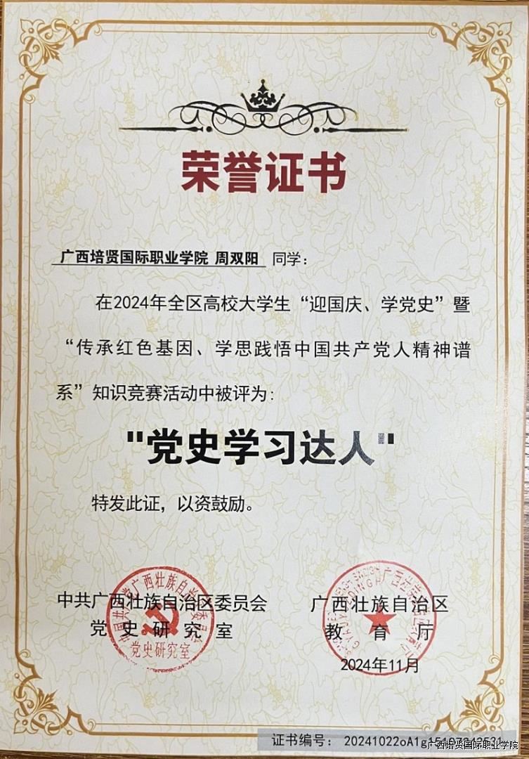近日🤳🏻🧘🏿♂️,全区高校大学生“迎国庆、学党史”暨“传承红色基因🏩、学思践悟中国共产党人精神谱系”知识竞赛广西赛区决赛获奖名单公布。我校国际学院(原外国语学院)国际商务专业周双阳同学荣获“党史学习达人”奖。