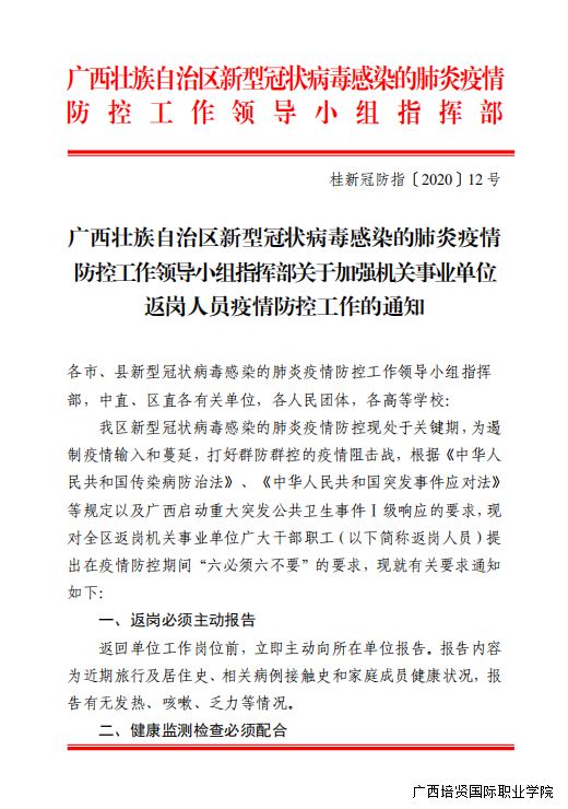 广西壮族自治区新型冠状病毒感染的肺炎疫情防控工作领导小组指挥部关于加强机关事业单位返岗人员疫情防控工作的通知