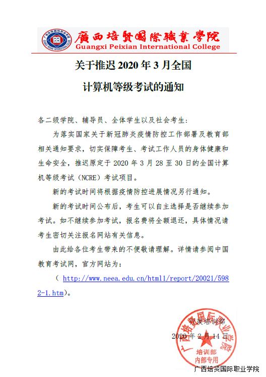 关于推迟 2020 年 3 月全国计算机等级考试的通知