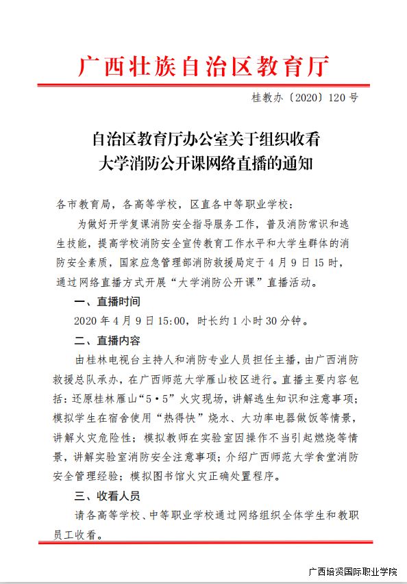 自治区教育厅办公室关于组织收看大学消防公开课网络直播的通知