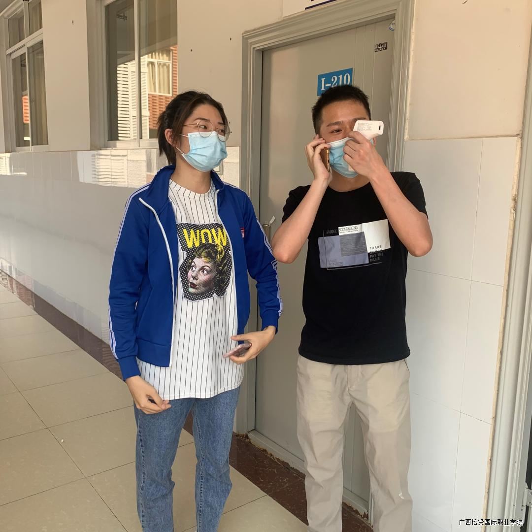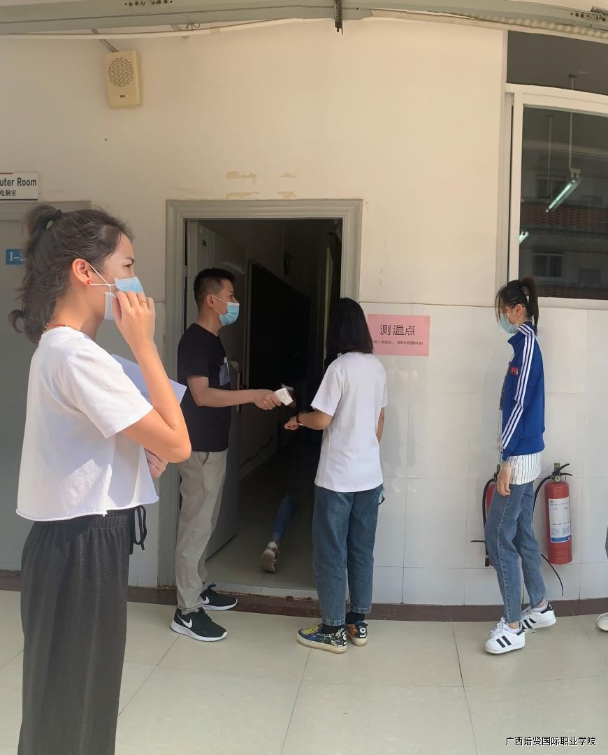 图三👇🏿:教师担任学生角色,相隔1米排队量体温进入教室。