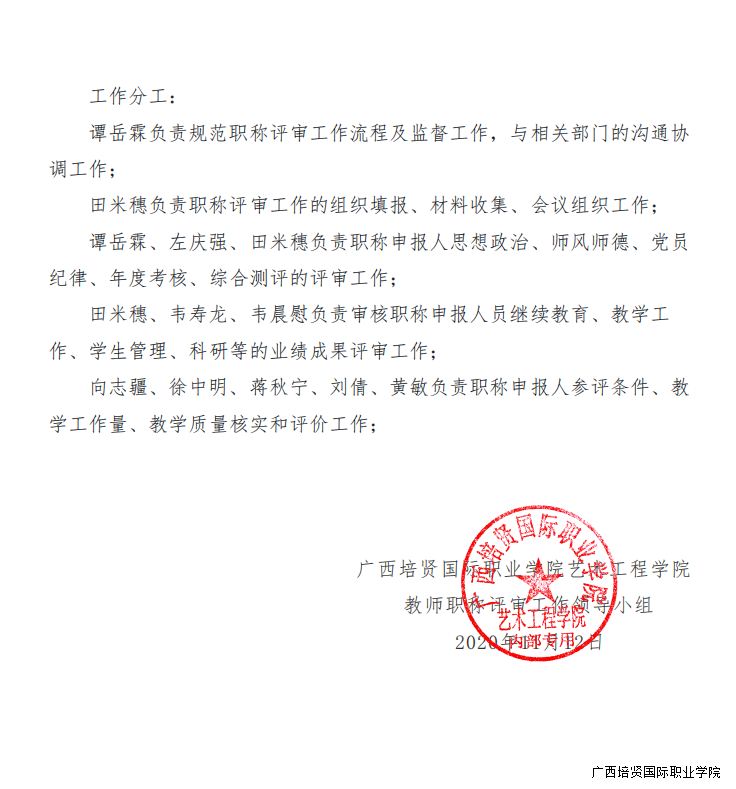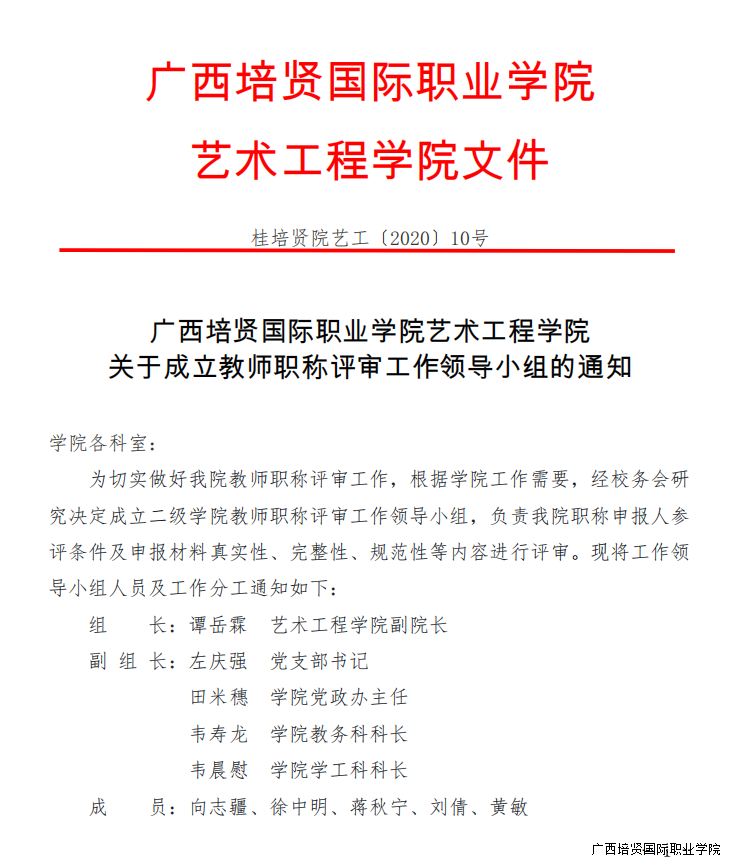 桂彩神院艺工〔2020〕10号广西彩神国际职业学院艺术工程学院关于成立教师职称评审工作领导小组的通知