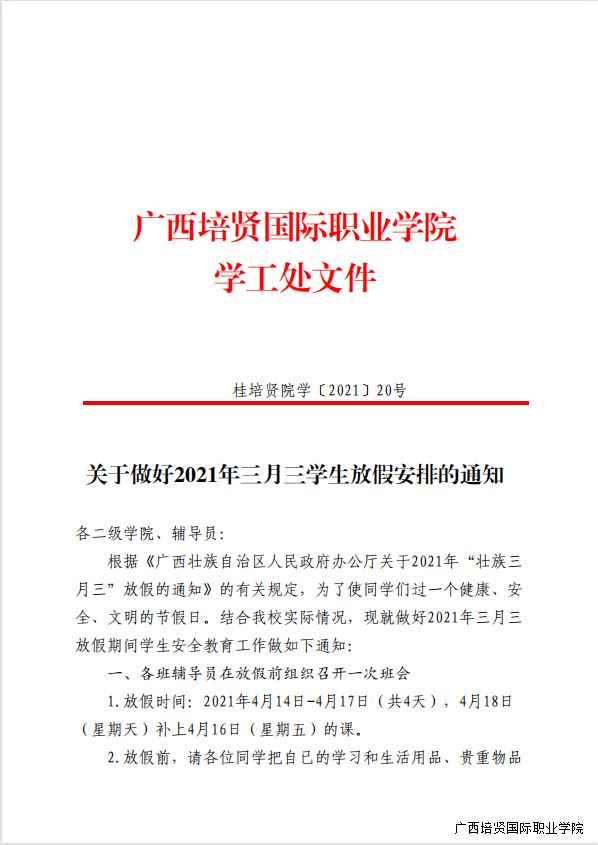 1. 关于做好2021年三月三学生放假安排的通知