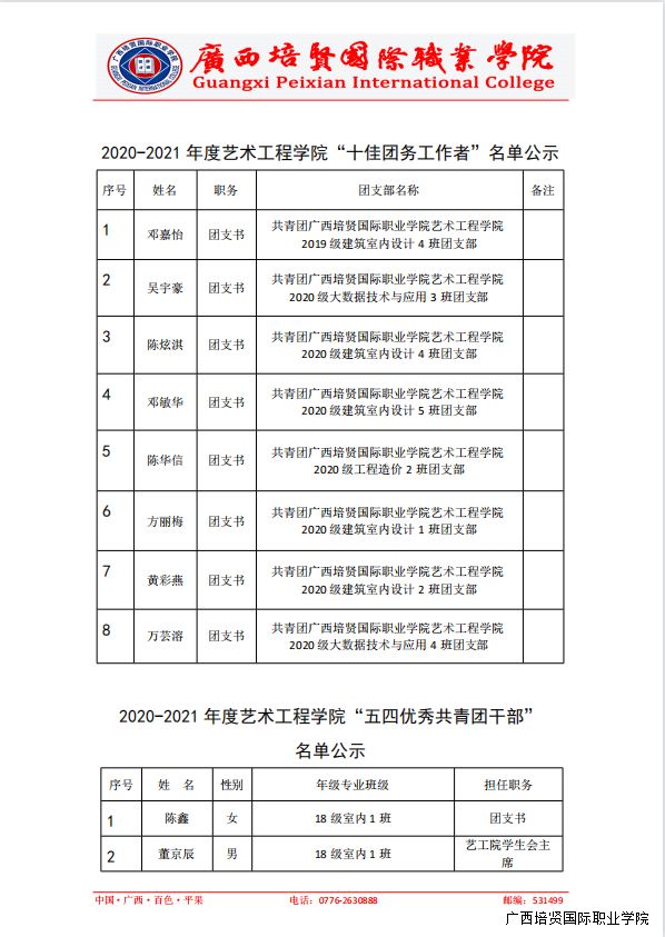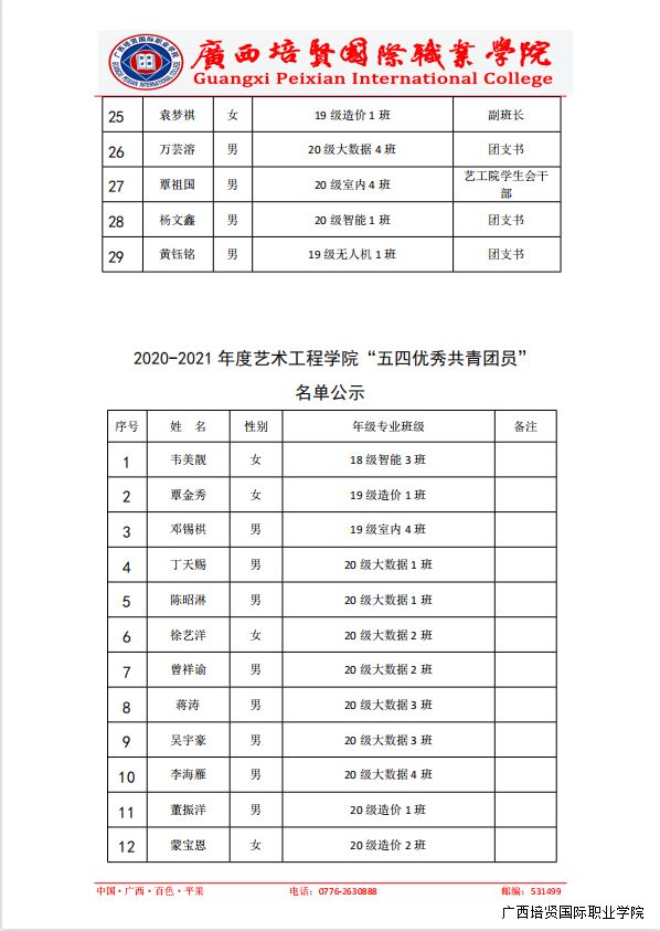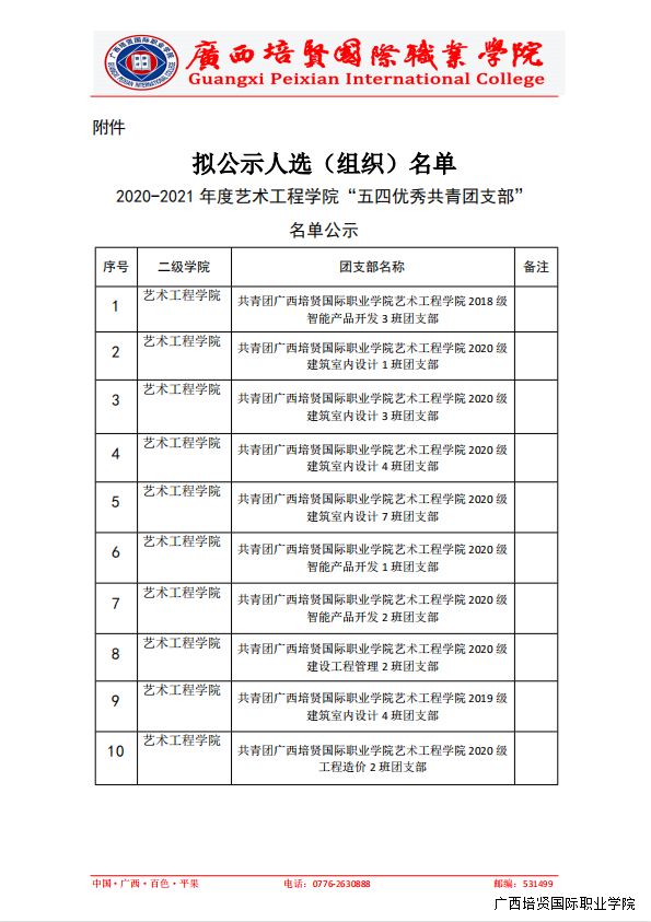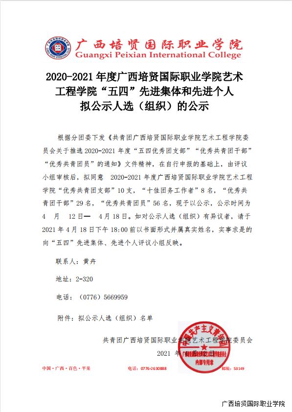 2020-2021年度广西彩神国际职业学院艺术工程学院“五四”先进集体和先进个人拟公示人选(组织)的公示