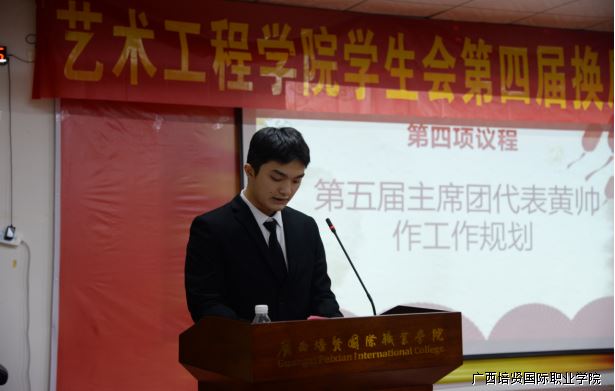 会议第四项议程:艺术工程学院第五届学生会主席团代表黄帅同学作学生会工作规划👌🏼。