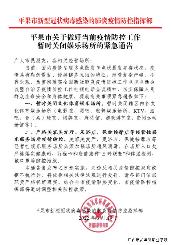 转发平果市关于做好当前疫情防控工作暂时关闭娱乐场所的紧急通告