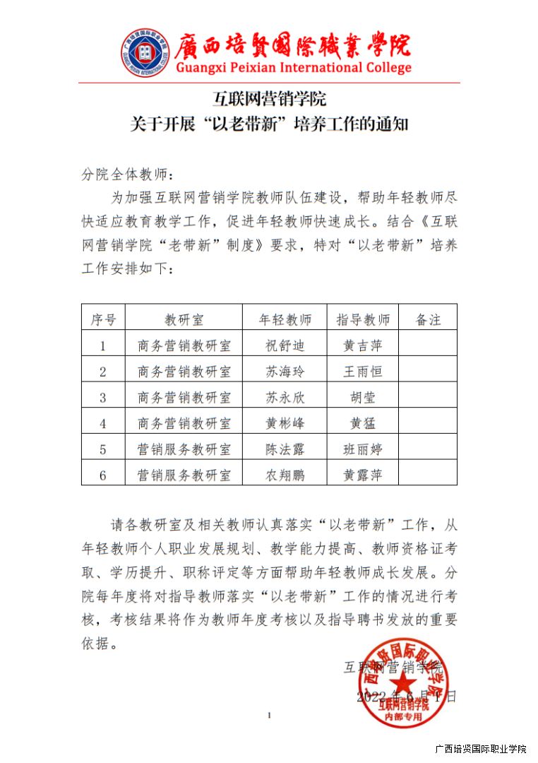 互联网营销学院关于开展“以老带新”培养工作的通知