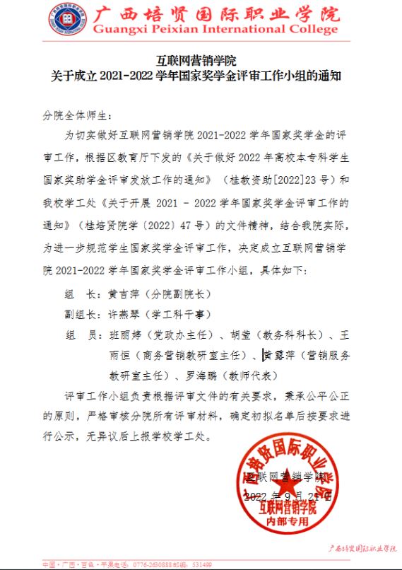互联网营销学院关于成立2021-2022年国家奖学金评审小组的通知