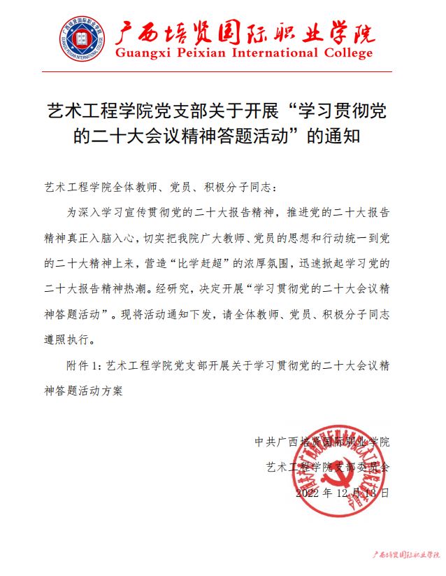 艺术工程学院党支部关于开展“学习贯彻党 的二十大会议精神答题活动”的通知