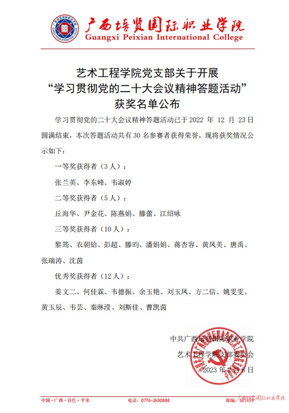 艺术工程学院党支部关于开展 “学习贯彻党的二十大会议精神答题活动” 获奖名单公布