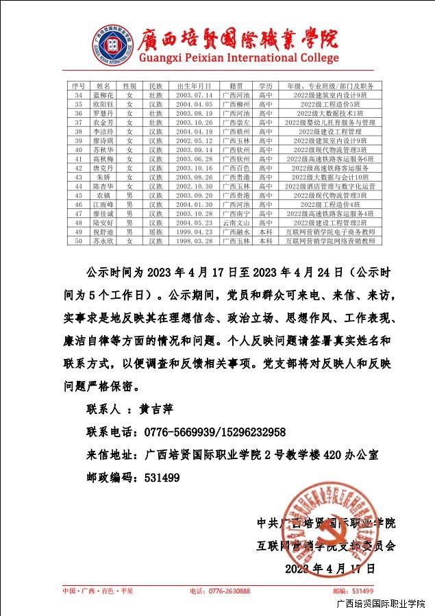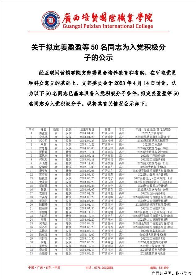 关于拟定姜盈盈等50名同志为入党积极分子的公示