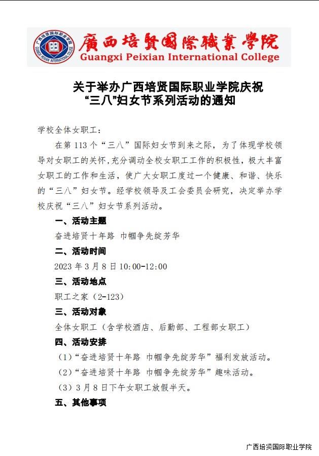 转工会委员会关于举办广西彩神国际职业学院庆祝三八妇女节系列活动的通知