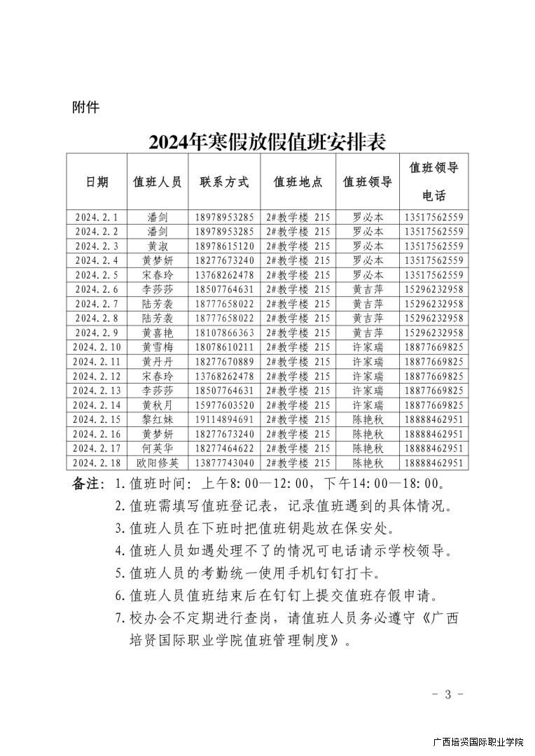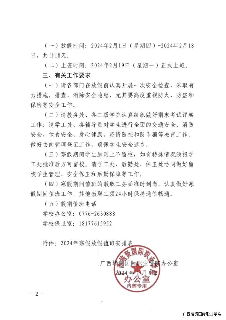 转学院办公室《广西彩神国际职业学院关于 2024 年寒假放假的通知》