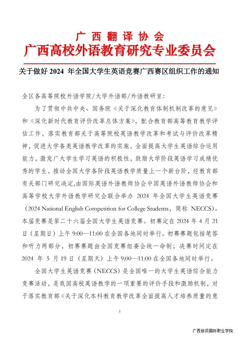 转广西翻译协会《关于做好 2024 年全国大学生英语竞赛广西赛区组织工作的通知》