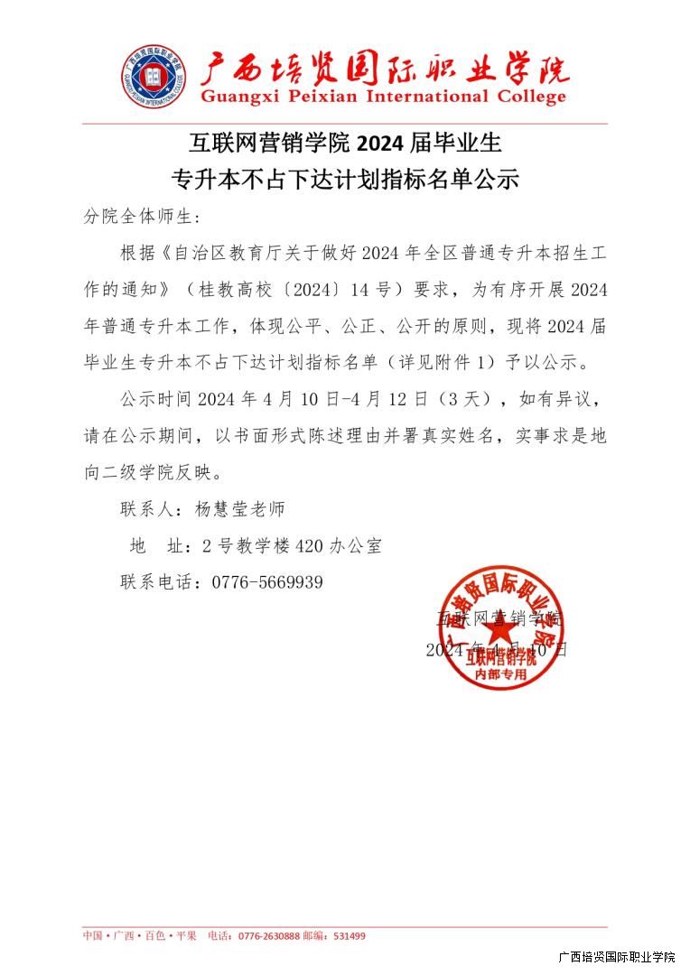 互联网营销学院 2024 届毕业生专升本不占下达计划指标名单公示