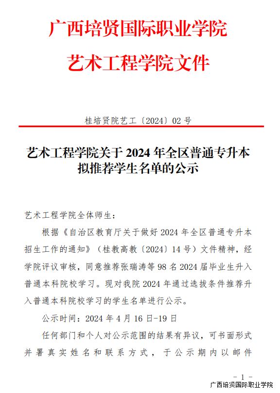 艺术工程学院关于 2024 年全区普通专升本 拟推荐学生名单的公示