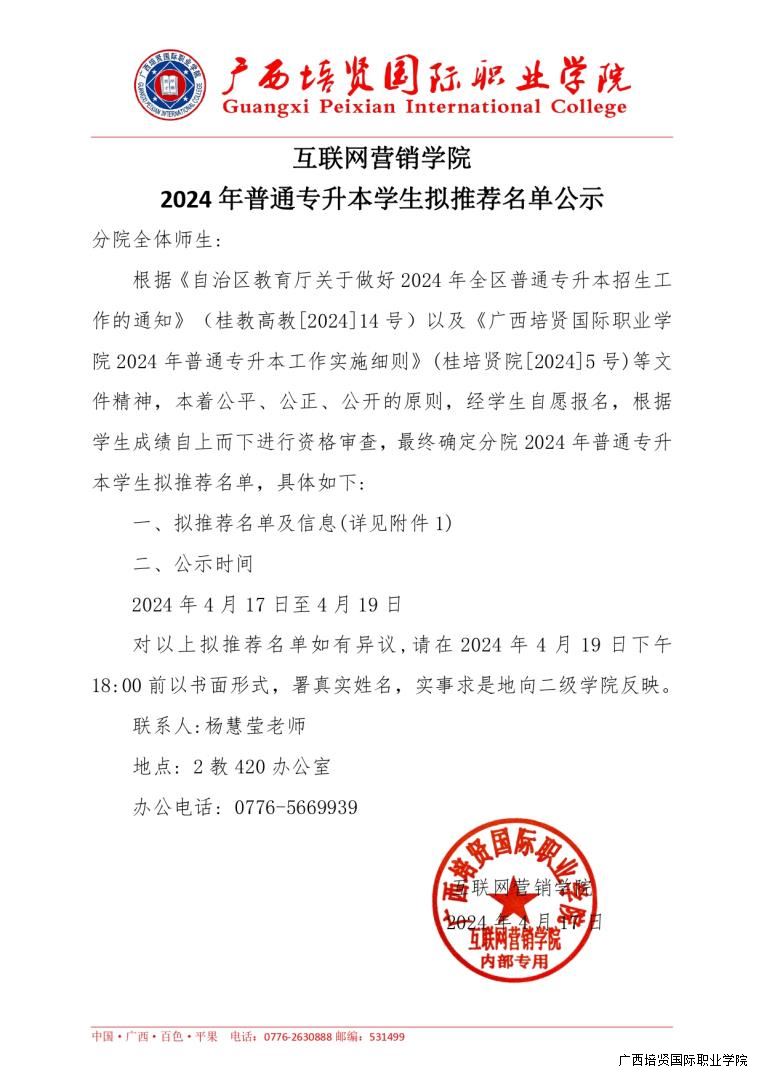 互联网营销学院2024年普通专升本学生拟推荐名单公示.pdf