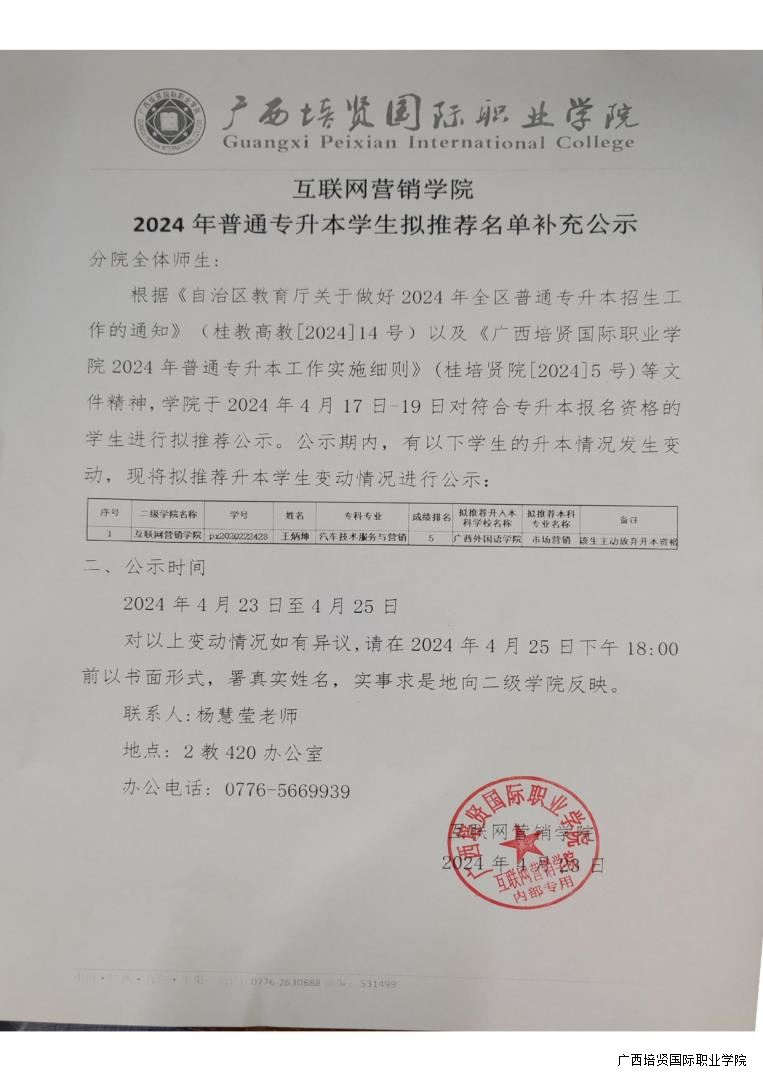 互联网营销学院2024年普通专升本学生拟推荐名单补充公示