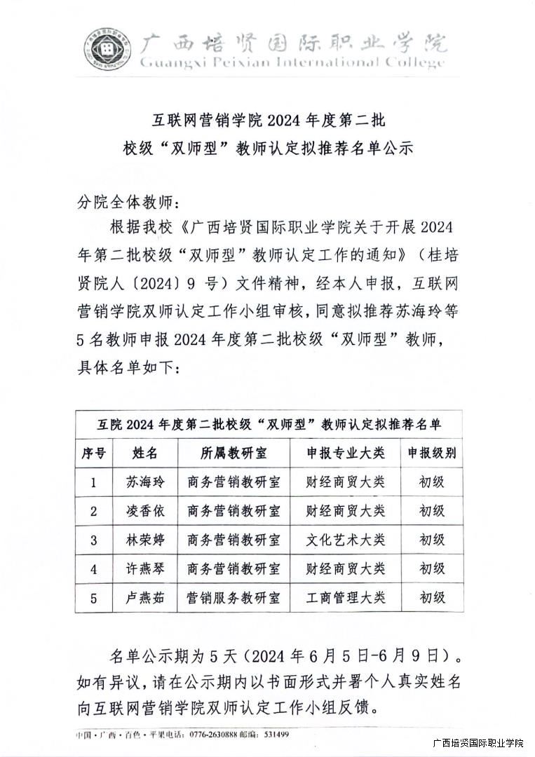 互联网营销学院2024年度第二批校级“双师型”教师认定拟推荐名单公示