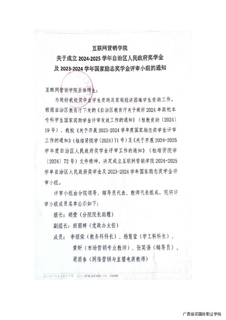 互联网营销学院关于成立2024-2025学年自治区人民政府奖学金及2023-2024学年国家励志奖学金评审小组的通知