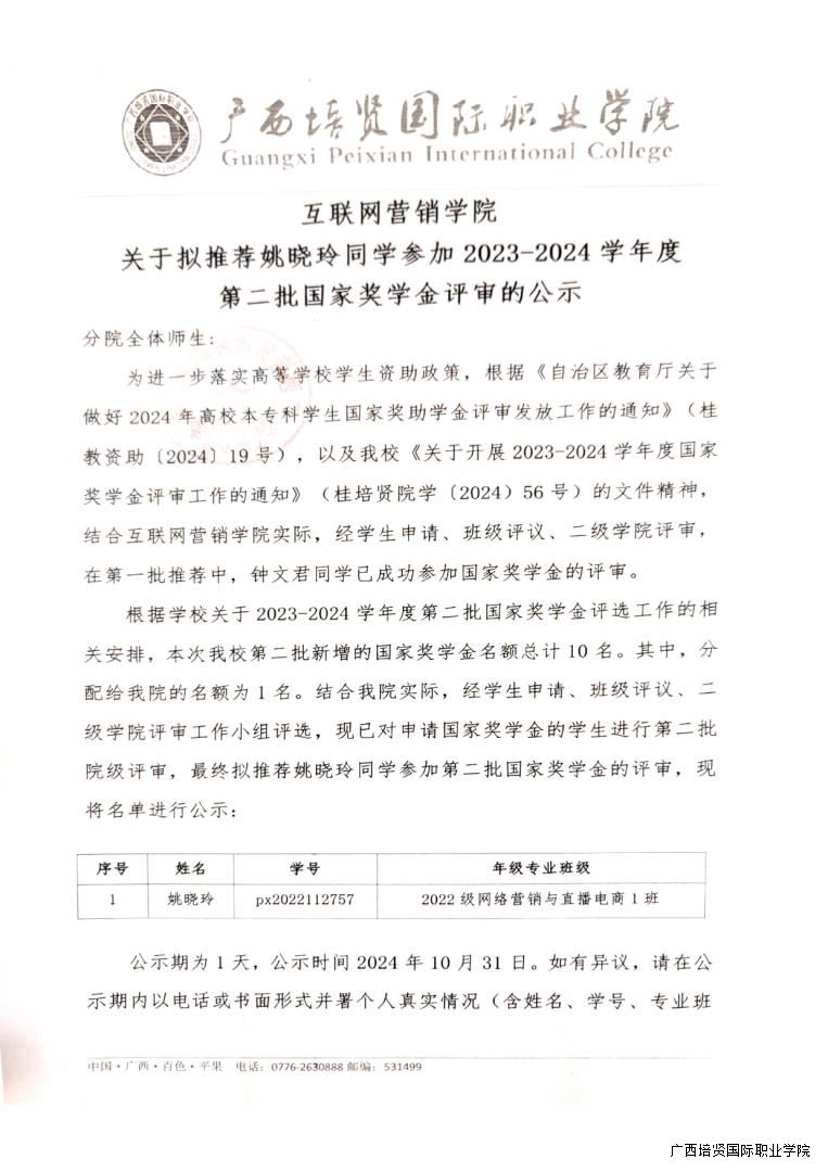1. 互联网营销学院关于拟推荐姚晓玲同学参加2023-2024学年度第二批国家奖学金评审的公示