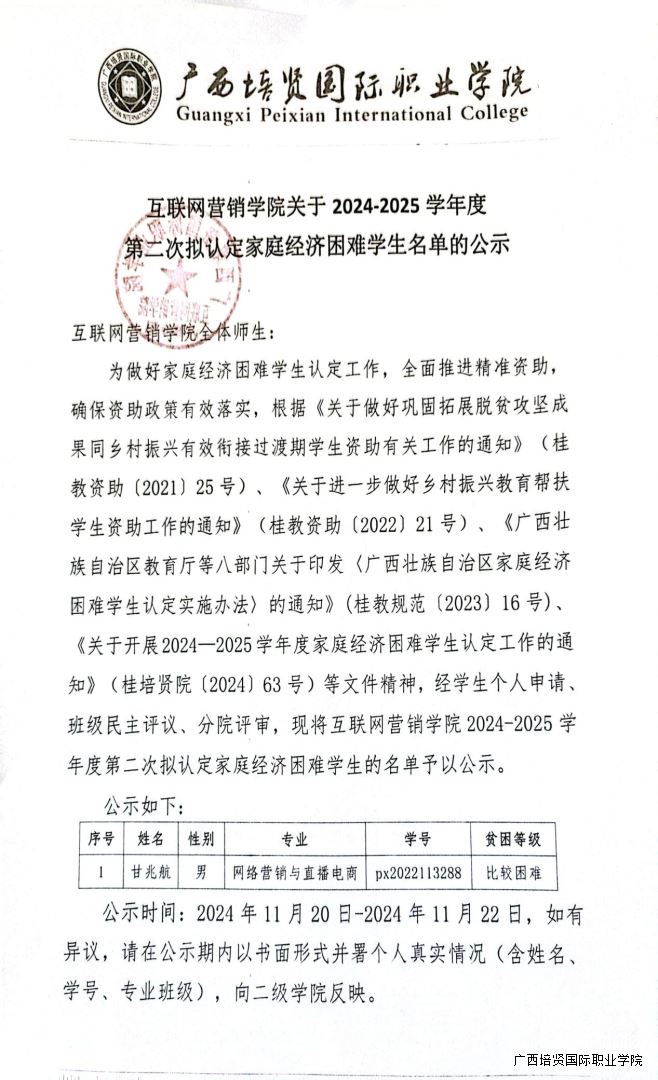 互联网营销学院关于2024-2025学年度第二次拟认定家庭经济困难学生名单的公示