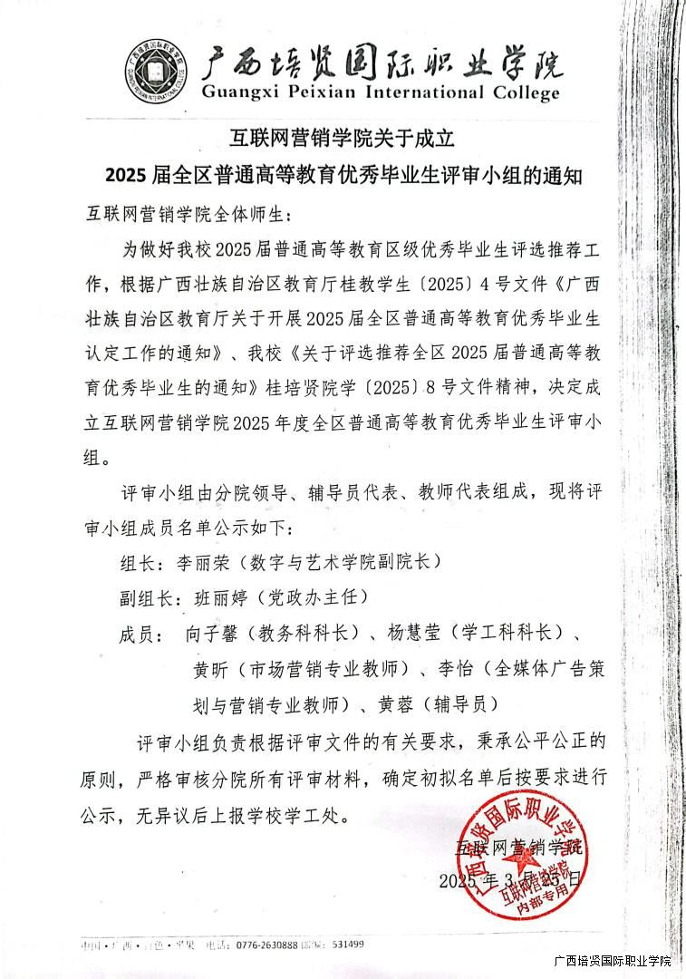 互联网营销学院关于成立2025届全区普通高等教育优秀毕业生评审小组的通知