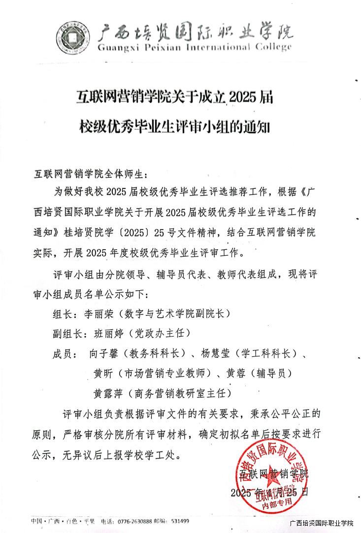 互联网营销学院关于成立2025届校级优秀毕业生评审小组的通知