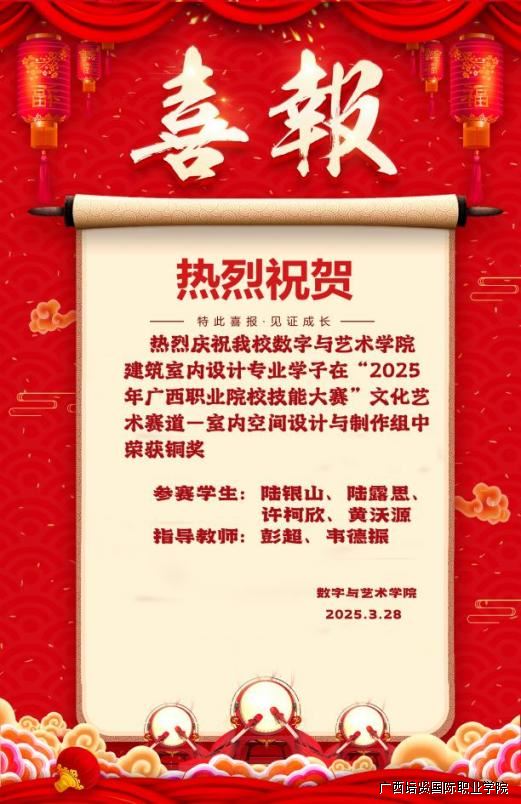 青春淬炼匠心2️⃣𓀎,技能点亮征程。在2025年广西职业院校技能大赛的舞台上👟👩🏿,广西彩神国际职业学院数字与艺术学院的师生们以昂扬的斗志和精湛的技艺😁,展现了新时代职教人的风采🔢。经过激烈角逐,我院建筑室内设计专业团队在“文化艺术赛道——室内空间设计与制作组”赛项中脱颖而出,凭借扎实的专业功底、创新的设计思维和卓越的团队协作能力🎰,最终荣获铜奖📩。这一荣誉不仅是对我院专业建设成果的高度认可,更是对师生们践行“技能成才,强国有我”誓言的生动诠释🕠。