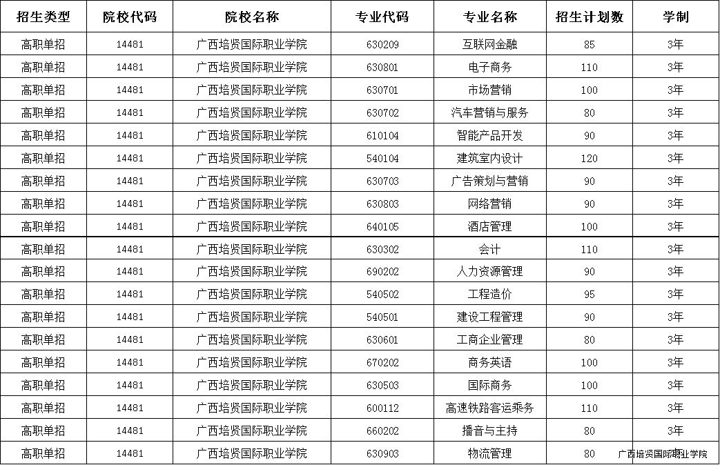广西彩神国际职业学院2017年单招招生计划