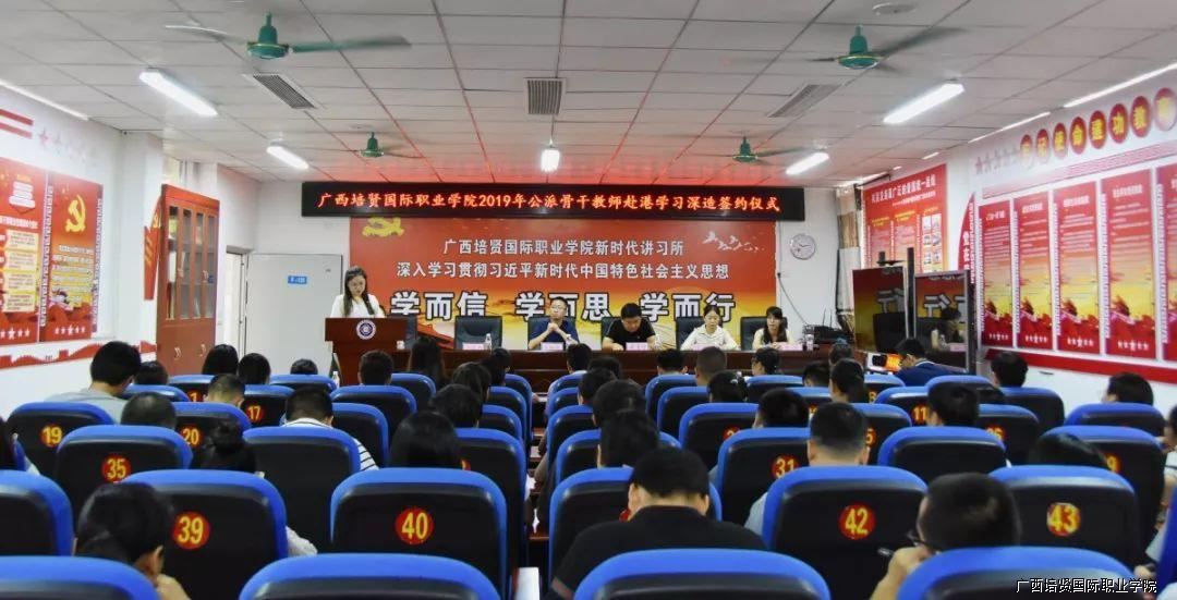 2019年8月16日我校在二号教学楼讲习所隆重召开了关于2019年公派骨干教师赴港学习深造签约仪式,参会的主要领导及人员分别有🏨:我校副校长黄勇学,副校长于灏洋♊️,各处室负责人以及全体在岗教职工,此次签约仪式由陆敏倩老师主持。