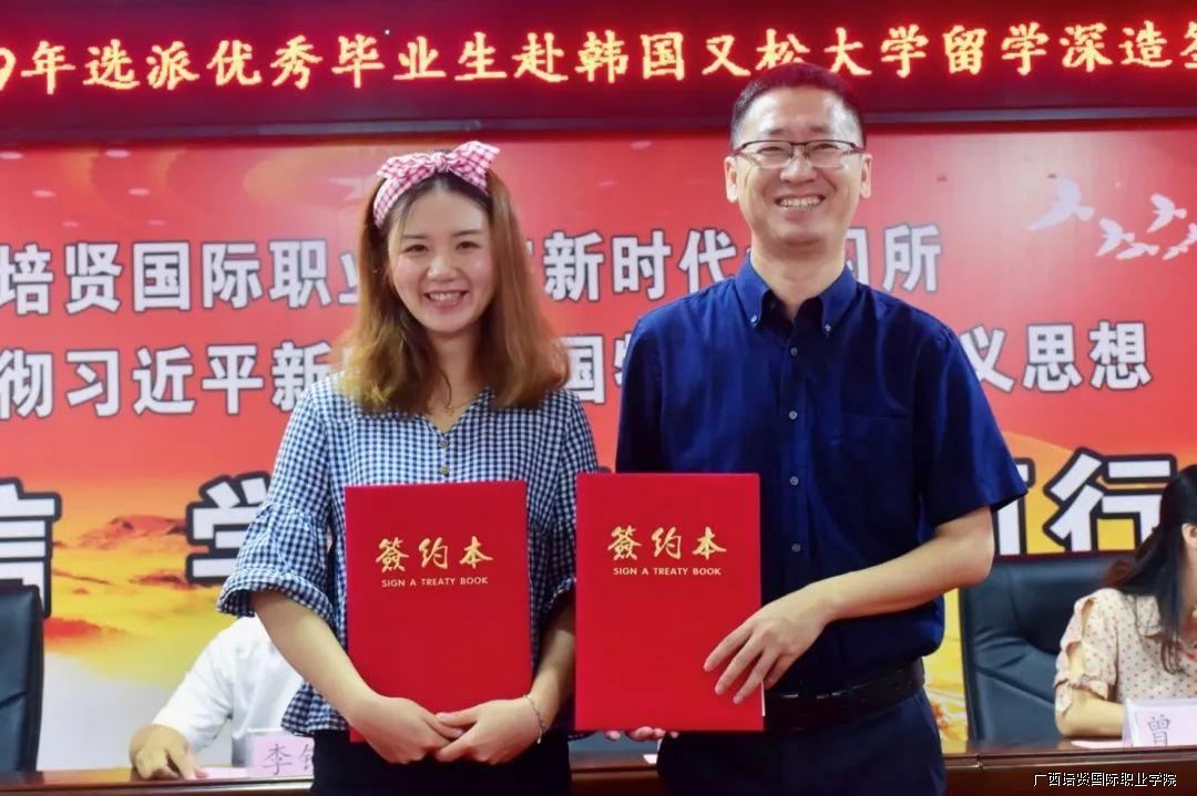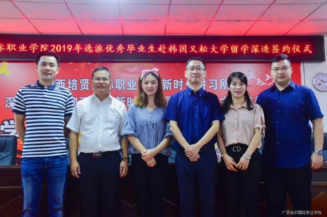 2019年8月21日上午10点😽,我校在2号教学楼122讲习所隆重举行2019年选派优秀毕业生赴韩国又松大学留学深造签约仪式,这是我校人才培养发展中的一件大事,也是我校与国外教育资源结合的重要推动力👨🏿‍🦱。出席本次签约仪式的领导有:我校副校长于灏洋🌘、副校长李锡武🫃🏽、培训部曾妮副主任、国际交流中心覃严生副主任以及优秀毕业生钟柳芳同学,和相关部门负责人🕝、在岗教职工🧎🏻‍♀️‍➡️。