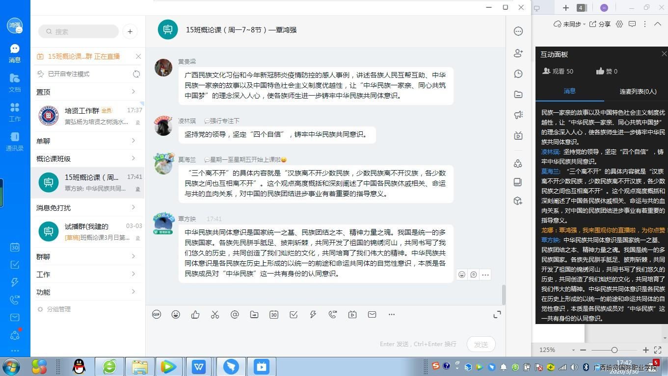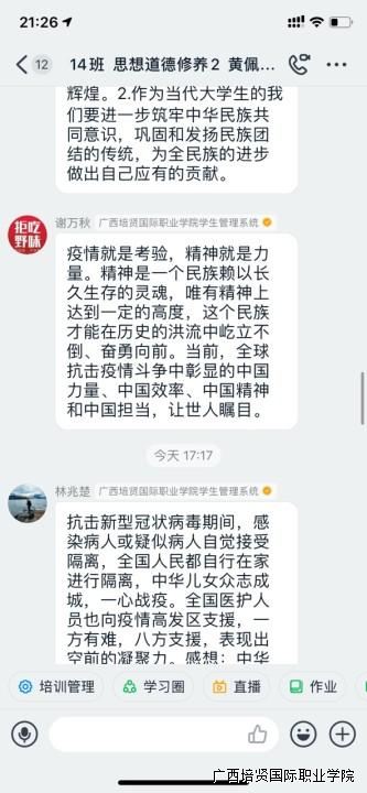 为弘扬和发展民族优秀传统文化,使学生进一步认识民族团结的重要性,加强学院新时代爱国主义思想教育。我院根据自治区教育厅相关工作部署,结合当前新冠肺炎疫情防控工作的形势需要,于3月26日组织学院学生观看2020年“三月三”学校民族团结进步教育线上课程。本次线上课程主题为“铸牢中华民族共同体意识👲🏻,凝聚起民族团结的磅礴力量”,我院学生按时收看本次课程,并结合课程内容与实际情况积极展开线上讨论🤾🏼。