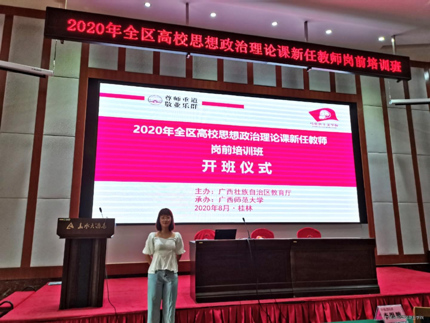 近日,为进一步加强我区高校思政教师队伍建设,不断提高思政教师教学水平,自治区教育厅决定举办全区高校思想政治理论课新任教师岗前系列培训班🔷。此次培训班开始的时间为2020年8月23日至8月28日👨🏼🔧,培训地点在桂林山水大酒店◽️🏋🏿♂️,来自全区66所高校的80名新入职的思政课教师参加了培训,我校思政部专任教师李木子参加了此次培训班活动🏌️♀️。