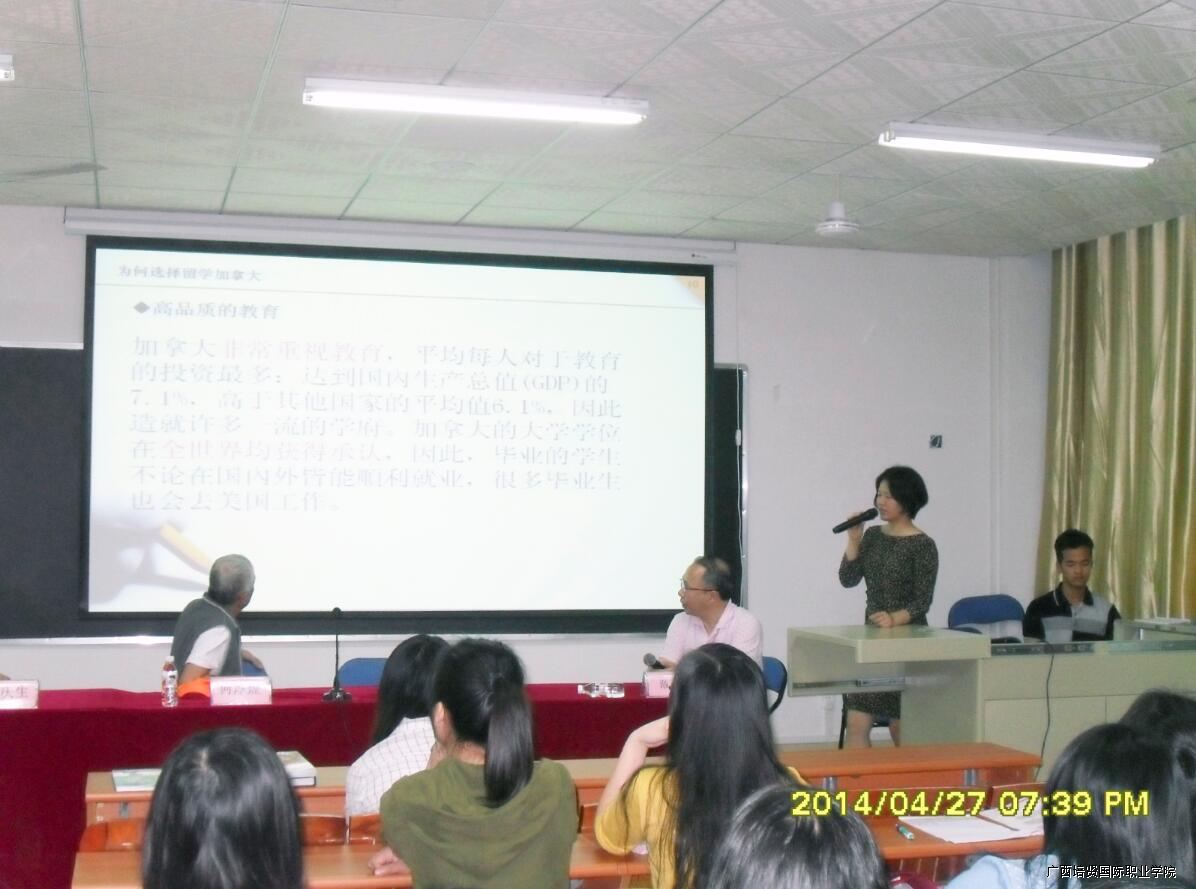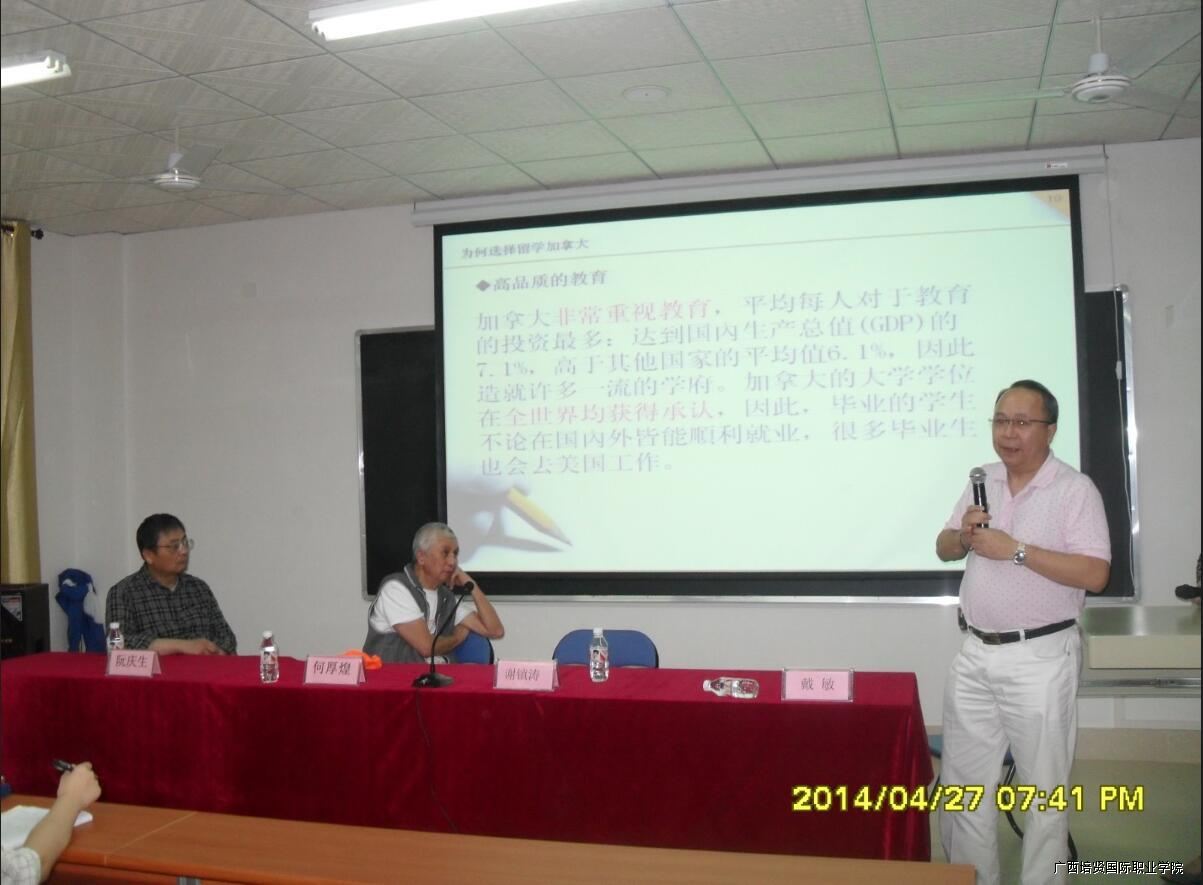 2014年4月27日晚🤍,“走进加拿大”讲座在我院学术报告厅举行。出席会议的有加拿大专家谢镇涛先生、广州臻达教育机构戴敏总经理、我院董事长何厚煌博士🧑🏻‍🎤、阮庆生副院长,以及我院的全体师生🕹。讲座主讲人是加拿大专家谢镇涛先生。