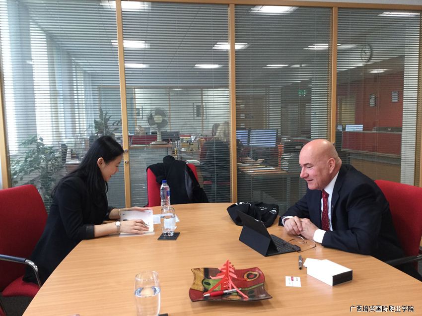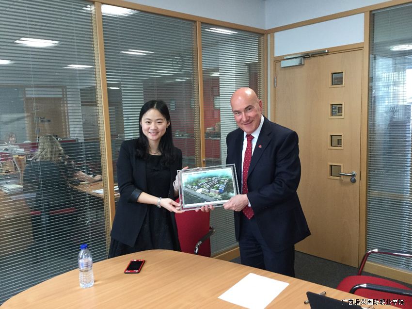 梁慈老师(左)代表我校与利兹三一大学校长Dr. Ray Lloyd(右)洽谈合作事宜
