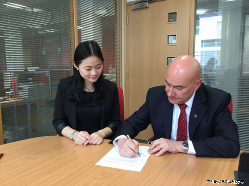 梁慈老师(左)代表我校与利兹三一大学校长Dr. Ray Lloyd(右)签订初步合作协议